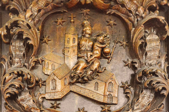 Das Wappen von Lucelle auf der Kanzel von 1699 (Hugues-Jean Monnot) mit der Weltenherrscherin auf dem Kirchendach.