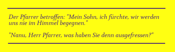 Gut ist es, wenn es die Schwachen sind, die lachen können, und die Starken, die sich ärgern. Sich über einen am Boden Liegenden lustig zu machen, ist genauso menschenverachtend, wie auf einen Besiegten einzutreten. (Das unterscheidet Judenwitze von jüdischen Witzen.) Aber alle, die Menschen unterdrücken oder Gewalt und Zwang propagieren, haben Spott und Satire verdient, egal ob es Politiker, Wirtschaftsführer, Militärs oder Kirchenleute sind. Weiterlesen